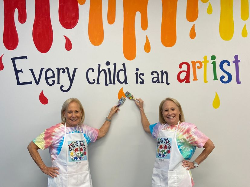 Jill and Jodi have always had a passion for art. From painting posters for their shared bedroom to creating school projects, artistic talent was in their DNA from the beginning. So, when it came time to head off to college, they wanted to combine their love for art and children and decided to major in Elementary Education at the University of Texas in Austin! From there, although distance separated them (Jodi moved to Houston and Jill headed back to Cleveland) they mirrored similar paths as children’s art teachers. Now, they’re finally reuniting after 35 years to open Artzy Twinz – a dream come true!